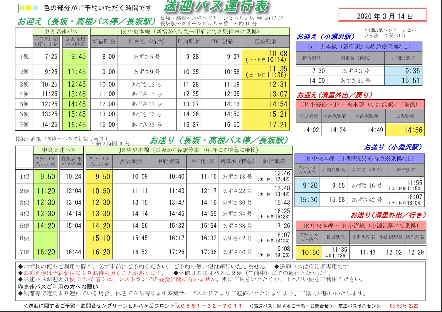 ご宿泊の方を対象に、グリーンヒル八ヶ岳と長坂高根バス停(高速バス)及び長坂駅(JR)、小淵沢駅(JR)間の送迎を行っております。運行時間は、下の「送迎バス運行表」で御確認ください。
