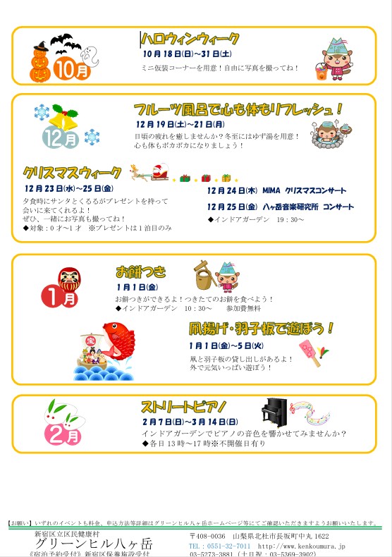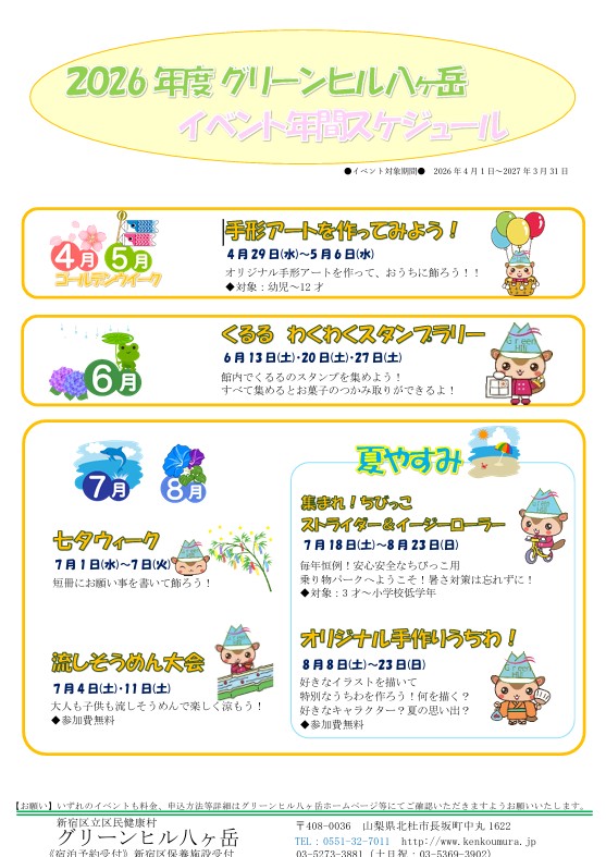 セルフプロデュースイベントスケジュール2026年度 セルフプロデュースイベントのスケジュールです! 皆様お誘いあわせの上、是非ご参加ください! 2026年度 グリーンヒル八ヶ岳 コンサートスケジュール 2026年の年間コンサートスケジュールです。 観賞無料のコンサートでございます。ご宿泊のご予定の参考になさって下さい!