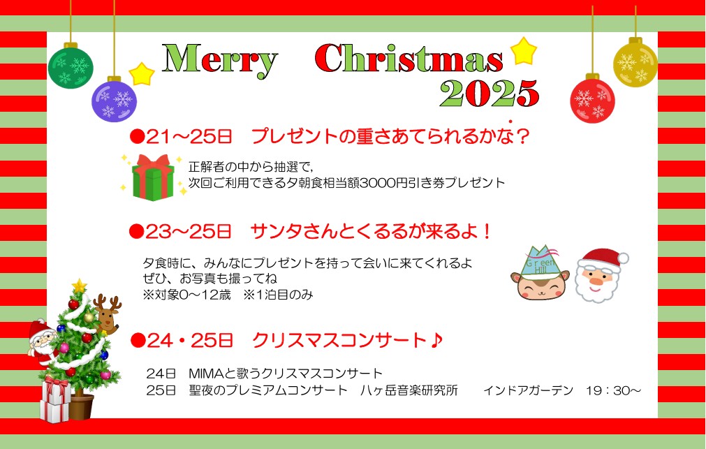 2025.08.25 2025年12月イベント一覧 天使が舞い降りるベルコンサート 【期間】2025年12月6日(土) 19:30~ 【内容】ノエルズによるミュージックベルコンサートです!お子様も楽しめるコンサートです! クリスマス目前!自分だけのマツボックリツリー作り 【期間】2025年12月13日・20日(土) 【内容】まつぼっくりをデコレーションして、クリスマスツリーを作ろう! 毎年恒例!フルーツ風呂で心も体もリフレッシュ! 【期間】2025年12月18日(木)~22日(月) 【内容】今年も大浴場でフルーツ風呂をお楽しいただけます。冬至の22日はゆず湯の予定です! グリーンヒル八ヶ岳 クリスマスウィーク 【期間】2025年12月21日(日)~25日(木) 【内容】今年もエントランスやレストラン外のイルミネーションを設置します! また、ミニゲーム「プレゼントの重さを当てよう!」もお楽しみに! MIMAと歌うクリスマスコンサート 【期間】2025年12月24日(水)19:30~ 【内容】MIMAさんによる、クリスマスイブの歌唱コンサートです。特別なクリスマスの思い出に! 聖夜のプレミアムコンサート ~木管五重奏による~ 【期間】2025年12月25日(木)19:30~ 【内容】八ヶ岳音楽研究所による、木管楽器コンサートです!特別なクリスマスの思い出に! 2025年11月イベント一覧 前の記事