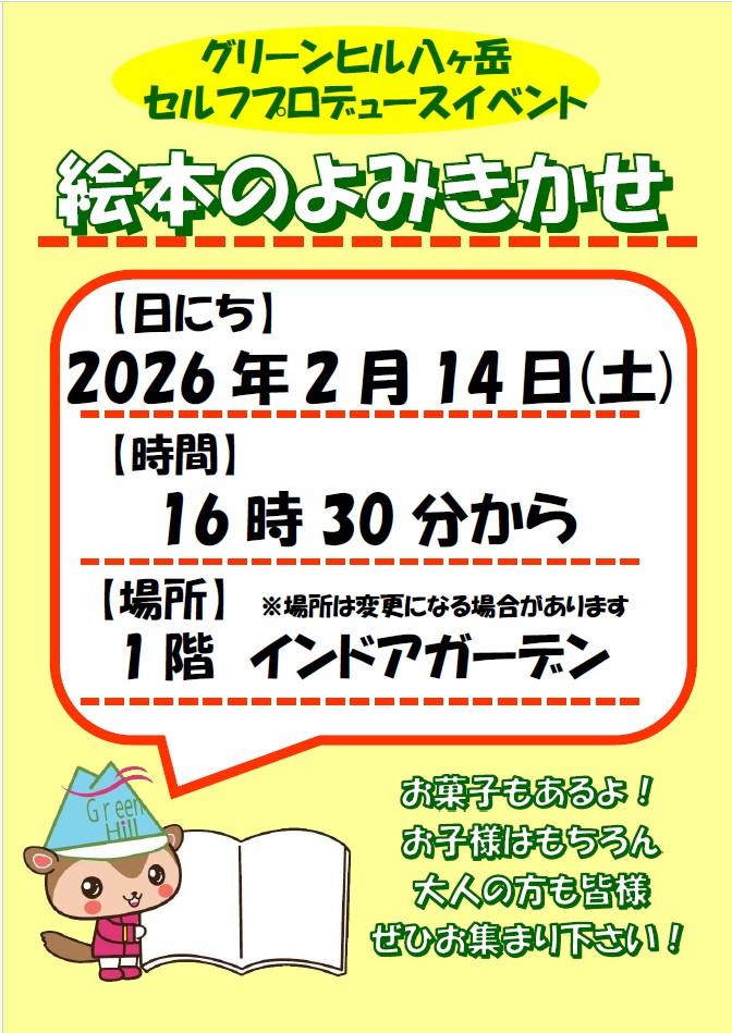 2025.12.14 2026年2月イベント一覧 ストリートピアノinグリーンヒル八ヶ岳 【期間】2026年2月7日(土)~3月14日(土) ※3月7日(土)、他ピアノ調律日は演奏できません。 【内容】今回のストリートピアノは冬開催! インドアガーデンに綺麗なピアノの音色を響かせましょう! 絵本の読み聞かせ 【期間】2026年2月14日(土) 16:30~ 【内容】絵本の読み聞かせを行います。読み聞かせを聞きながら食べられる駄菓子もありますよ~ お子様はもちろん、大人の方もお気軽にお越しください! 2026年1月イベント一覧 前の記事 2026年3月イベント一覧 次の記事