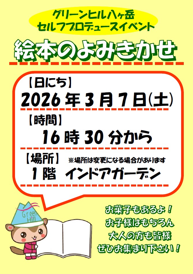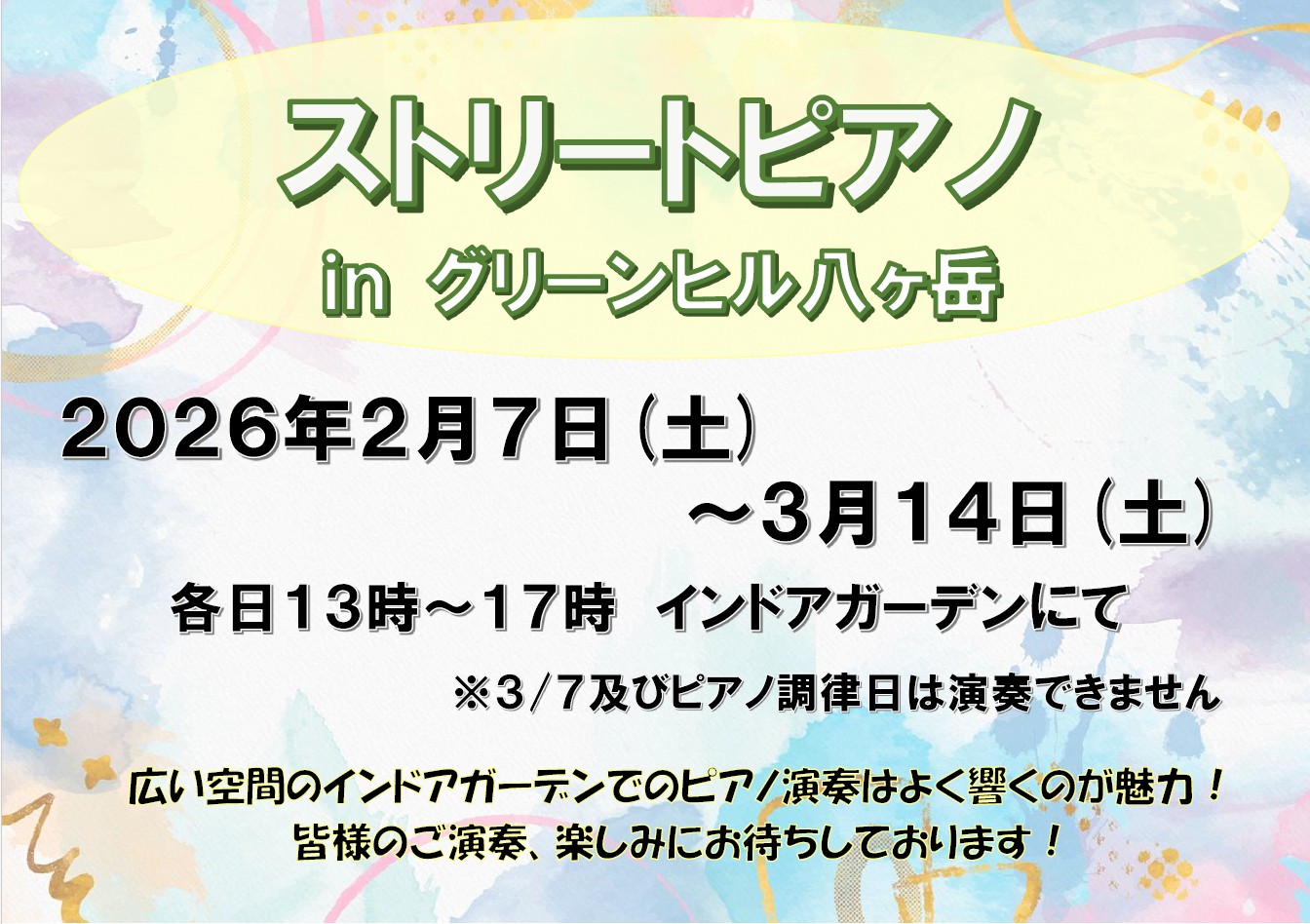 2025.12.14 2026年3月イベント一覧 ストリートピアノinグリーンヒル八ヶ岳 【期間】2026年2月7日(土)~3月14日(土) ※3月7日(土)、他ピアノ調律日は演奏できません 【内容】今回のストリートピアノは冬開催! インドアガーデンに綺麗なピアノの音色を響かせましょう! 絵本の読み聞かせ 【期間】2025年3月7日(土) 16:30~ 【内容】絵本の読み聞かせを行います。読み聞かせを聞きながら食べられる駄菓子もありますよ~ お子様はもちろん、大人の方もお気軽にお越しください! 2026年2月イベント一覧 前の記事