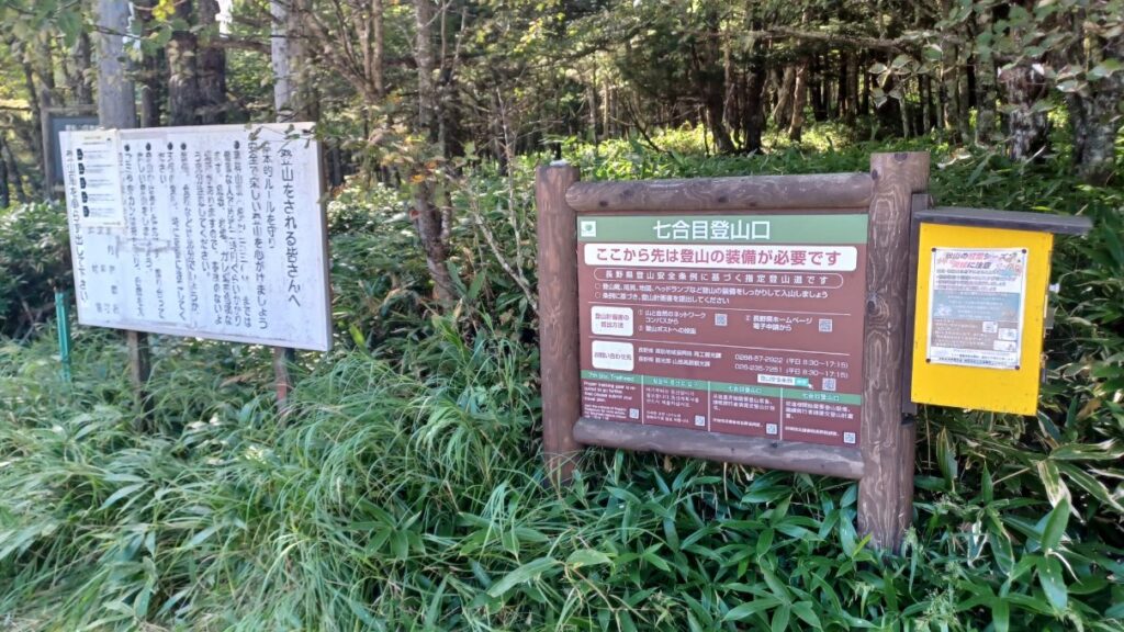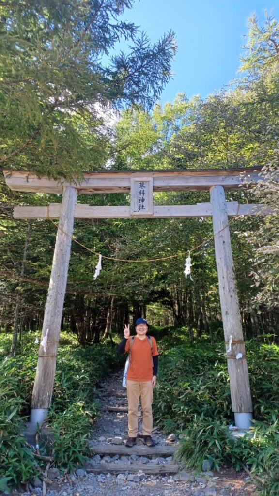 ① 午前9時。天気は快晴。7合目の蓼科神社より出発です。ここまでは車で来ました。
