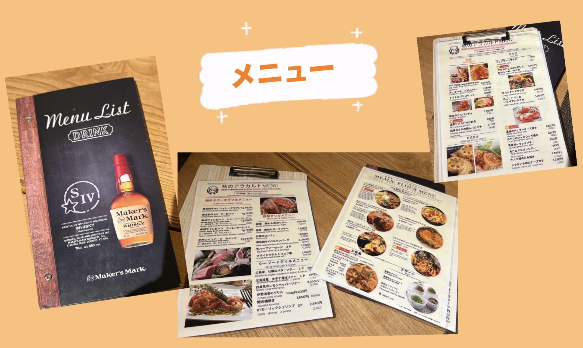 メニューはステーキやお好み焼き、ワインなどのお酒もバリエーション豊富でした!