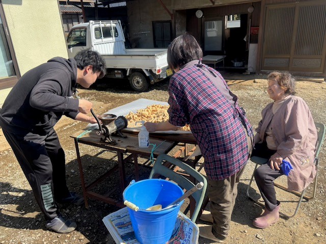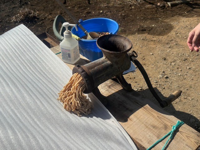 それを大豆すりつぶし機(豆ミンサーと呼ぶそうです)に入れて、ハンドルをぐるぐる回して潰していきます。