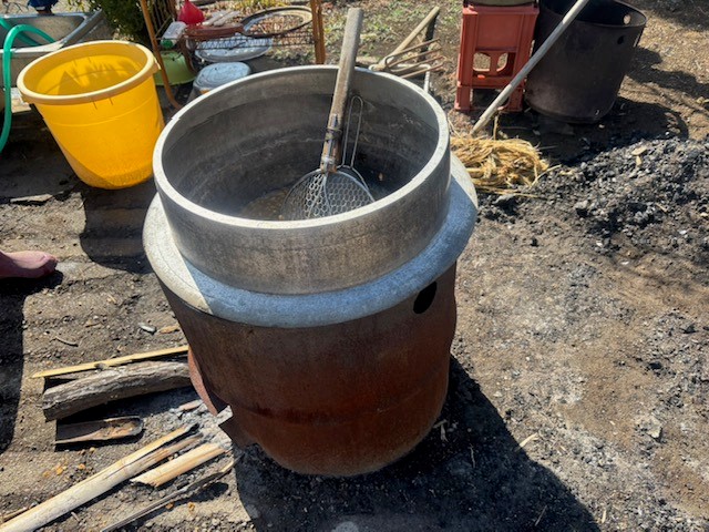 この日は快晴で、汗ばむほどの陽気の中、庭で大豆(5kg)を大鍋で煮ます。