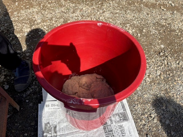 まぜまぜした状態のものに大豆の茹で汁を加え、大きな団子を作り、ハンバーグの要領で中の空気を抜き、桶の中へ叩きつけるように投げ込んでいきます(これも空気が入らないようにするためです)。